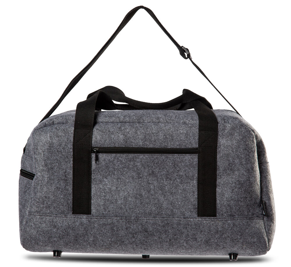 Upptäck vår praktiska och miljövänliga duffelväska i grått filttyg tillverkad av 100% R-PET. Väskan har två mindre fack, ett på framsidan och ett på kortsidan, båda är utrustade med blixtlås för mindre tillbehör. Den stabila botten med bottendubbar och den stora lagringskapaciteten gör den perfekt för resor och daglig användning. Kan bäras med antigen axelrem eller handtag.