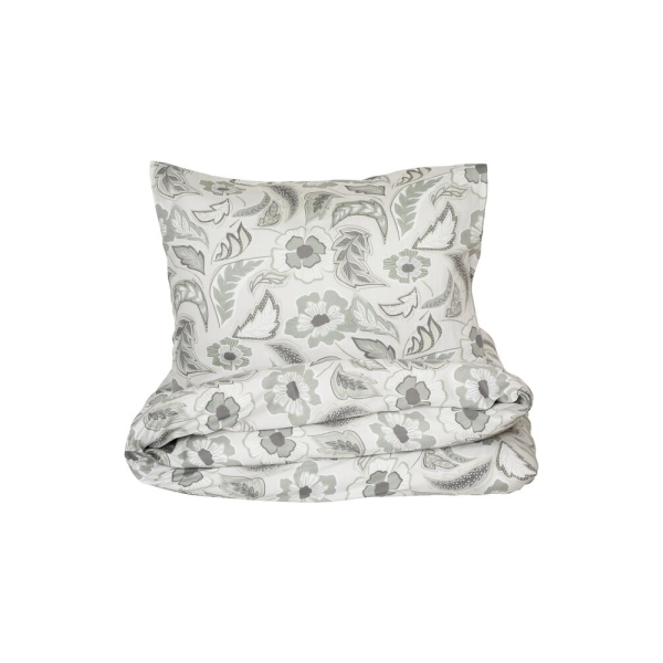 Bäddset i skön och mjuk satin med modernt paisleyinspirerat mönster i mjuka beiga och grå toner mot vit botten.