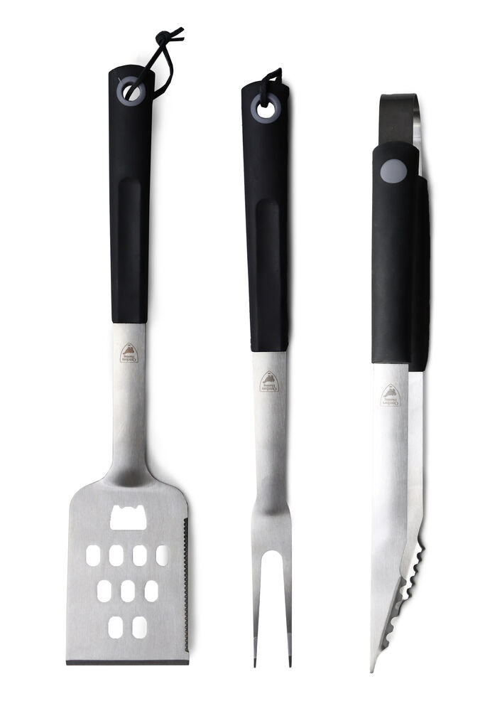 Stilrent grillset beståendes av en tång, en stekspade och en gaffel. Allt du behöver för att tillaga en perfekt middag på grillen. En snygg tygpåse med dragsko medföljer så att du även kan ge bort grillsetet som en fin present till grillmästaren!