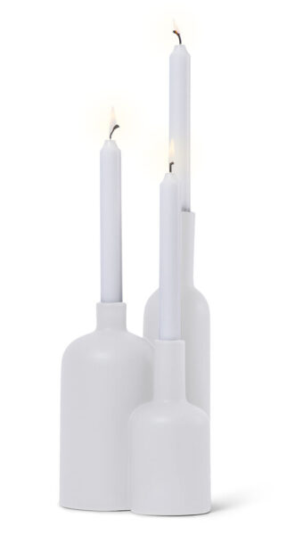 Denna charmiga ljusstake i porslin är formad som tre flaskor som sitter ihop. Den ger ett fint ljussken då ljusen hamnar i olika höjd. Passar fint i många olika miljöer.